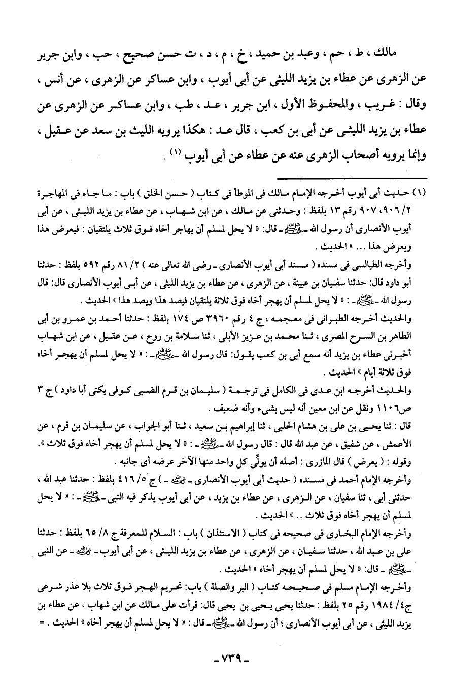 وأخرجه الإمام البخاري في صحيحه في كتاب (الاستئذان) باب: السلام للمعرفة ج 8/ 65 بلفظ: حدثنا علي بن عبد الله، حدثنا سفيان، عن الزهري، عن عطاء بن يزيد الليثى، عن أبي أيوب - رضي الله عنه - عن النبي - صلى الله عليه وسلم - قال: "لا يحل لمسلم أن يهجر أخاه" الحديث.