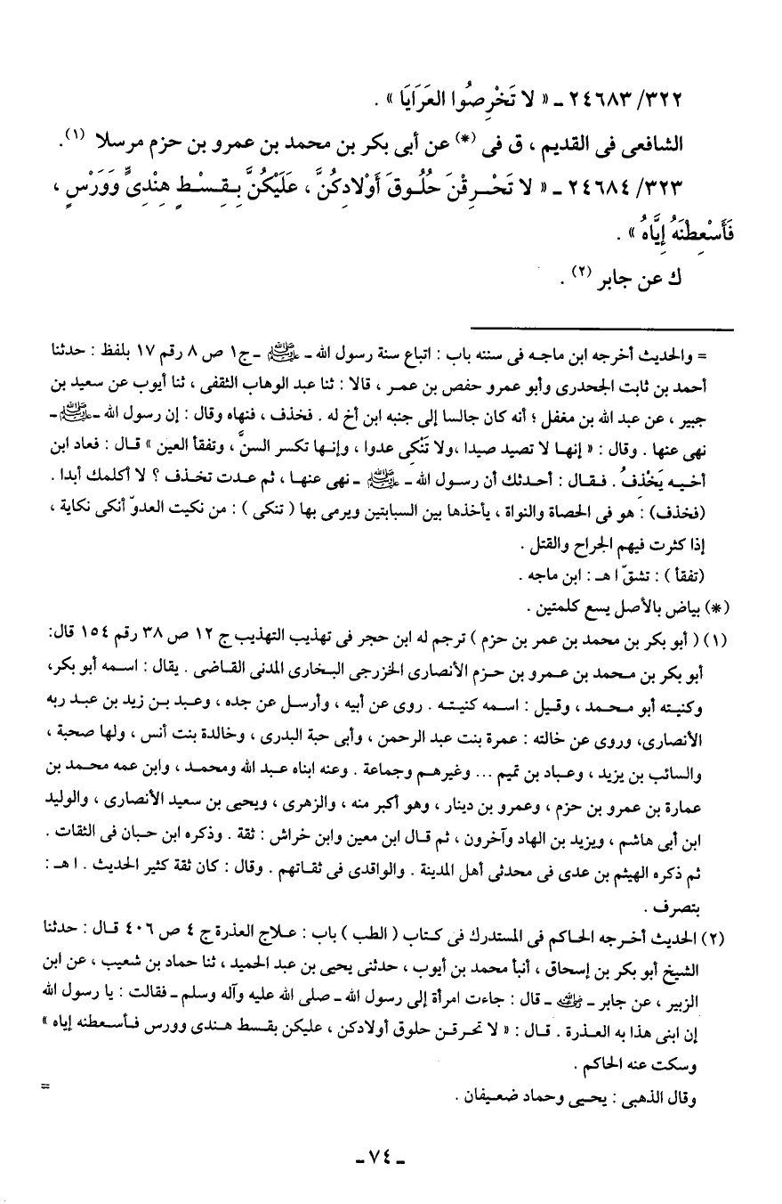 (¬2) الحديث أخرجه الحاكم في المستدرك في كتاب (الطب) باب: علاج العذرة ج 4 ص 406 قال: حدثنا الشيخ أبو بكر بن إسحاق، أنبأ محمد بن أيوب، حدثني يحيى بن عبد الحميد، ثنا حماد بن شعيب، عن ابن الزبير، عن جابر - رضي الله عنه - قال: جاءت امرأة إلى رسول الله - صلى الله عليه وآله وسلم - فقالت: يا رسول الله إن ابنى هذا به العذرة. قال: "لا تحرقن حلوق أولادكن، عليكن بقسط هندى وورس فأسعطنه إياه" وسكت عنه الحاكم.