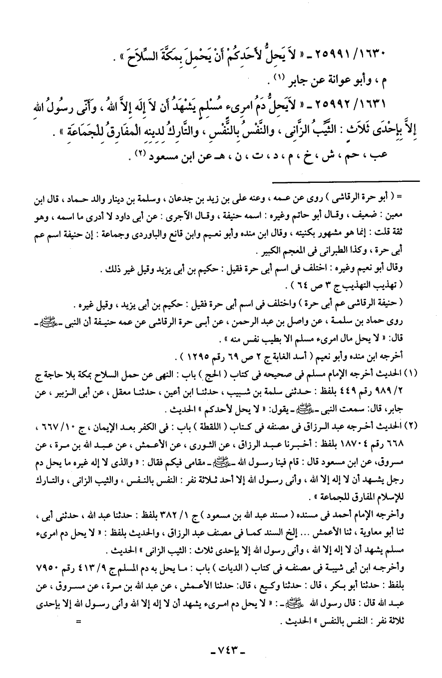 1631/ 25992 - "لَا يَحِلُّ دَمُ امرِيءٍ مُسْلِمٍ يَشْهَدُ أَن لَا إِلَه إلا اللهُ، وَأَنِّي رسُولُ اللهِ إلا بِإِحْدَى ثَلَاثٍ: الثَّيِّبُ الزَّانِي، والنَّفْسُ بِالنَّفْسِ، والتَّارِكُ لِدِينِهِ الْمفَارِقُ لِلْجَمَاعَةِ".
