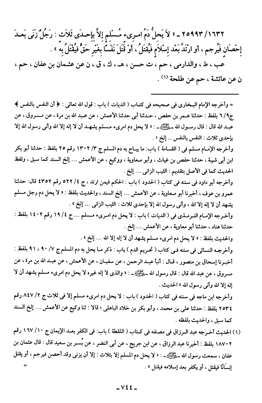 1632/ 25993 - "لَا يَحِلُّ دَمُ امرِيءٍ مُسْلِمٍ إلا بِإِحدَى ثَلَاثٍ: رَجُلٌ زَنَى بَعدَ إِحْصَانٍ فَيُرجم، أو ارْتَدَّ بَعْد إِسْلَامٍ فَيُقتَلُ، أَوْ قَتَلَ نَفْسًا بِغَيرِ حَقٍّ فيُقْتَلُ بِه".