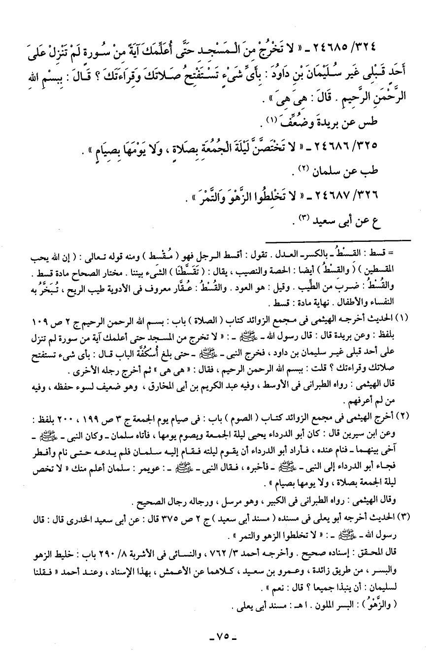 325/ 24686 - "لا تَخْتَصَّنَّ لَيلَةَ الْجُمُعَةِ بِصَلاةٍ، وَلا يَوْمَهَا بِصِيَامٍ".