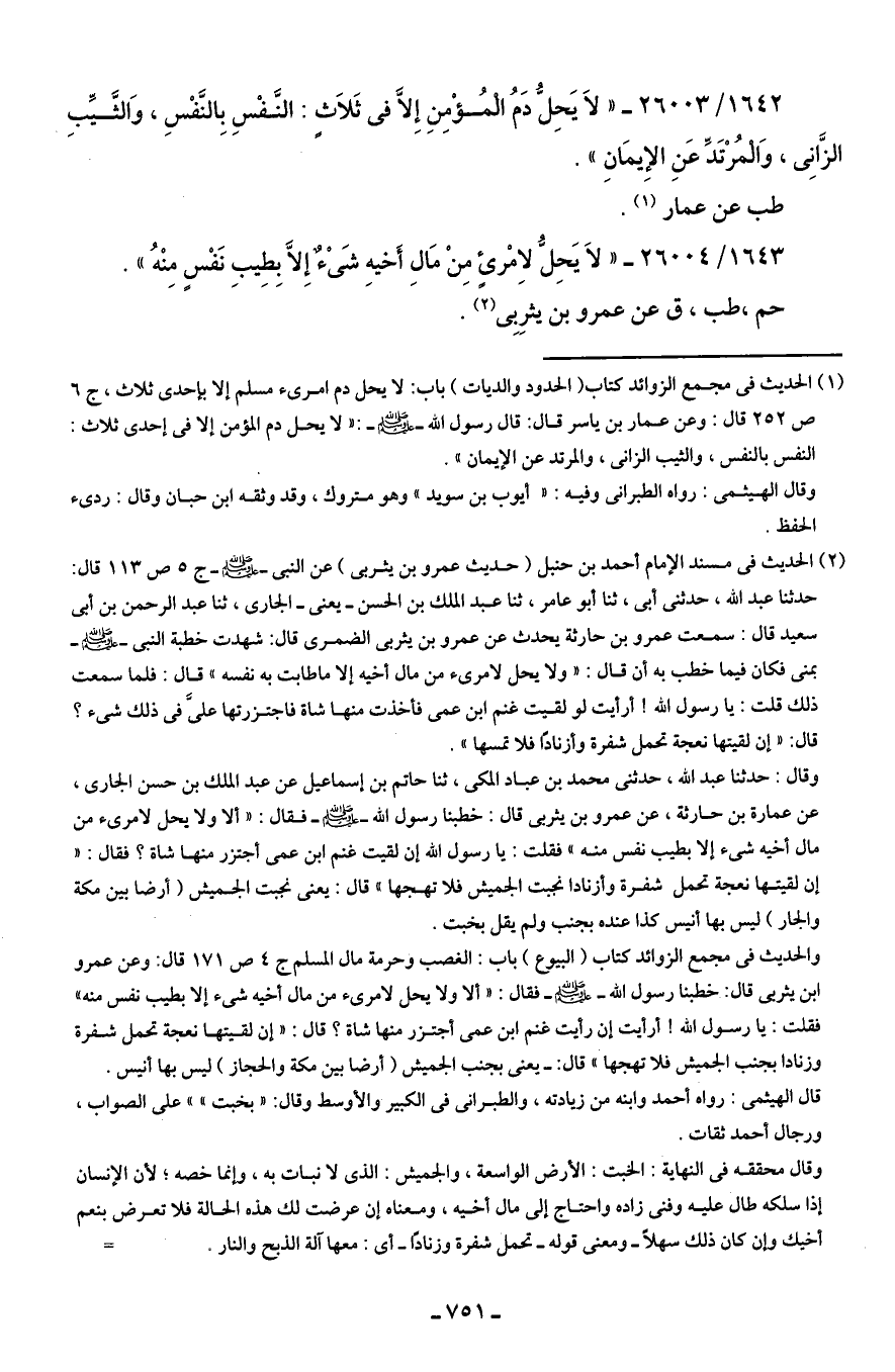 1642/ 26003 - "لَا يَحِلُّ دَمُ الْمُؤْمِنِ إلا في ثَلَاثٍ: النَّفْسِ بِالنَّفْسِ، وَالثَّيِّبِ الزَّانِي، وَالْمُرْتَدِّ عَنِ الإِيمَانِ".