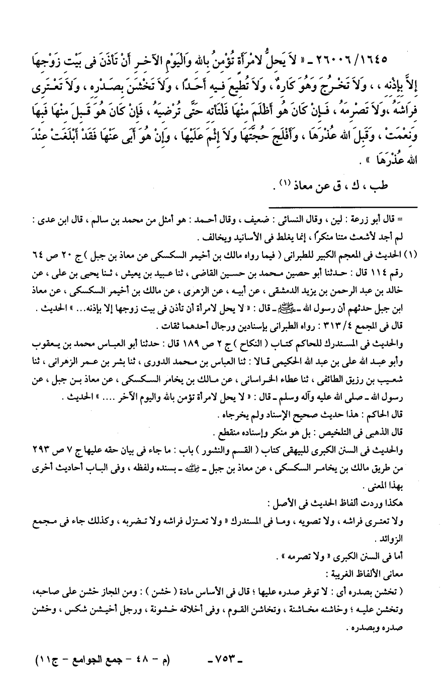 1645/ 26006 - "لَا يَحِلُّ لامْرَأَةٍ تُؤْمِنُ بِاللهِ وَالْيَوْمِ الآخِرِ أَنْ تَأذَنَ في بَيتِ زَوْجِهَا إلا بِإِذْنِهِ, وَلَا تَخْرُجَ وَهُوَ كَارِهٌ، وَلَا تُطِيعَ فِيهِ أَحَدًا، وَلَا تَخْشَنَ بِصَدْرِهِ، وَلَا تَعْتَرِي فِرَاشَهُ، وَلَا تَصْرِمَهُ، فَإِنْ كَانَ هُو أَظْلَمَ مِنْهَا فَلْتَأتِهِ حَتَّى تُرْضِيَهُ، فَإِنْ كَانَ هُوَ قَبِلَ مِنْهَا فَبِهَا وَنِعْمَتْ، وَقَبِلَ الله عُذْرَهَا، وَأَفْلَجَ حُجَّتَهَا وَلَا إِثْمَ عَلَيهَا، وَإِنْ هُوَ أَبَى عَنْهَا فَقَدْ أَبْلَغَتْ عِنْدَ الله عُذْرَهَا".