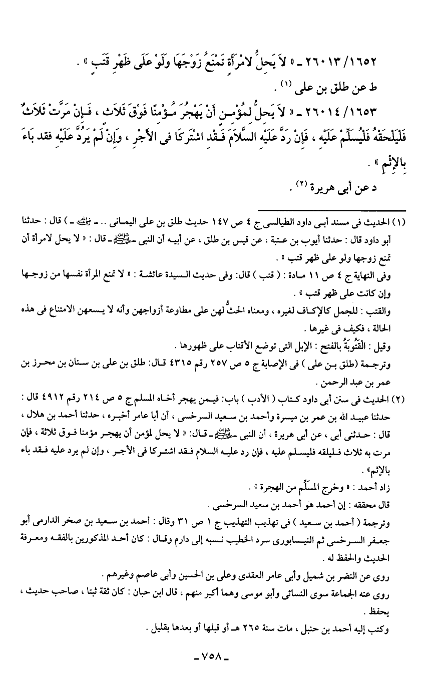 (¬1) الحديث في مسند أبي داود الطيالسي ج 4 ص 147 حديث طلق بن علي اليماني .. - رضي الله عنه -) قال: حدثنا أبو داود قال: حدثنا أيوب بن عتبة، عن قيس بن طلق، عن أبيه أن النبي - صلى الله عليه وسلم - قال: "لا يحل لامرأة أن تمنع زوجها ولو على ظهر قتب".