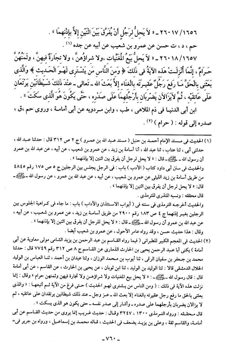 1657/ 26018 - "لَا يَحِلُّ بَيْعُ المُغَنِّياتِ، ولا شِراؤُهنَّ، ولا تِجَارَةٌ فيهِنَّ، وثَمَنُهُنَّ حَرَامٌ، إِنَّمَا أُنزِلَتْ هَذِهِ الآيَةُ في ذَلِكَ {وَمِنَ النَّاسِ مَنْ يَشْتَرِي لَهْوَ الْحَدِيثِ} وَالَّذِي بَعَثَنِي بِالْحَقِّ مَا رَفعَ رَجُلٌ عَقِيرَتَه بالْغِنَاءِ إلا بَعَثَ الله -تَعالى- عِنْدَ ذَلِكَ شَيطَانَينِ يَرْتَعَانِ عَلَى عَاتِقَيهِ، ثُمَّ لَا يَزَالانِ يَضْربَانِ بِأَرْجُلِهِمَا عَلَى صَدْرِهِ، حَتَّى يَكُونَ هُوَ الَّذِي سَكَتَ".