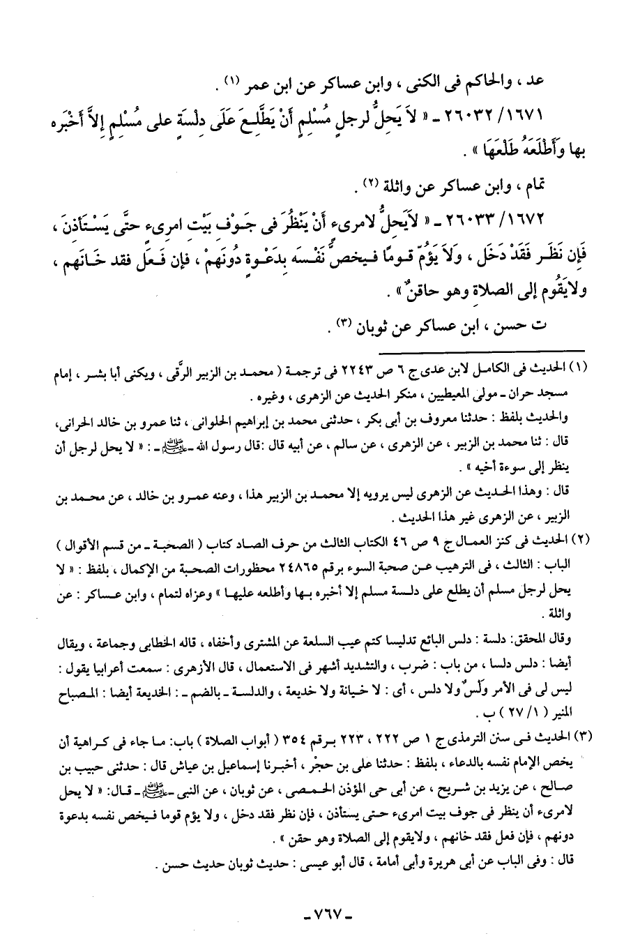 1671/ 26032 - "لَا يَحلُّ لرجلٍ مُسْلِمٍ أنْ يَطَّلِعَ عَلَى دِلْسَةٍ على مُسْلِمٍ إلَّا أخْبَره بها وَأَطْلَعَهُ طَلْعَهَا".