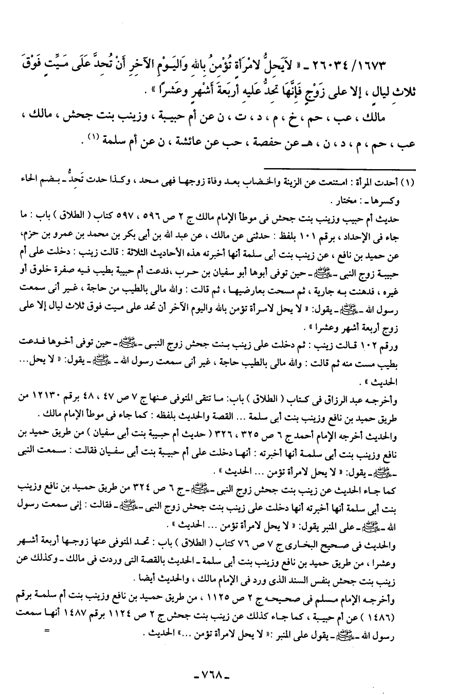 حديث أم حبيب وزينب بنت جحش في موطأ الإمام مالك ج 2 ص 566، 597 كتاب (الطلاق) باب: ما جاء في الإحداد، برقم 101 بلفظ: حدثني عن مالك، عن عبد الله بن أبي بكر بن محمد بن عمرو بن حزم، عن حميد بن نافع، عن زينب بنت أبي سلمة أنها أخبرته هذه الأحاديث الثلاثة: قالت زينب: دخلت على أم حبيبة زوج النبي - صلى الله عليه وسلم - حين توفى أبوها أبو سفيان بن حرب، فدعت أم حبيبة بطيب فيه صفرة خلوق أو غيره، فدهنت به جارية، ثم مسحت بعارضيها، ثم قالت: والله ما لي بالطيب من حاجة، غير أنى سمعت رسول الله - صلى الله عليه وسلم - يقول: "لا يحل لامرأة تؤمن بالله واليوم الآخر أن تحد على ميت فوق ثلاث ليال إلا على زوج أربعة أشهر وعشرًا".