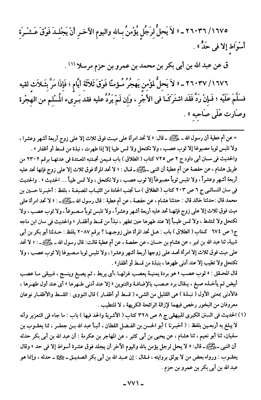 والحديث في سنن أبي داود ج 2 ص 725 كتاب (الطلاق) باب فيمن تجتنبه المعتدة في عدتها برقم 2302 من طريق هشام، عن حفصة عن أم عطية أن النبي - صلى الله عليه وسلم - قال: "لا تحد المرأة فوق ثلاث إلا على زوج فإنها تحد عليه أربعة أشهر وعشرًا، ولا تلبس ثوبًا مصبوغًا إلا ثوب عصب، ولا تكتحل، ولا تمس طيبًا ... الحديث". والحديث في سنن النسائي ج 6 ص 203 كتاب (الطلاق) ما تجنب الحادة من الثياب المصبغة، بلفظ: أخبرنا حسين بن محمد قال: حدثنا خالد قال: حدثنا هشام، عن حفصة، عن أم عطية: قال رسول الله - صلى الله عليه وسلم -: "لا تحد امرأة على ميت فوق ثلاث إلا على زوج فإنها تحد عليه أربعة أشهر وعشرًا، ولا تلبس ثوبًا مصبوغًا، ولا ثوب عصب، ولا تكتحل ولا تمتشط، ولا تمس طيبًا إلا عند طهرها حين تطهر، نبذًا من قسط وأظفار" والحديث في سنن ابن ماجه ج 1 ص 674 كتاب (الطلاق) باب: هل تحد المرأة على زوجها؟ برقم 2087 بلفظ: حدثنا أبو بكر بن أبي شيبة، ثنا عبد الله بن نمير، عن هشام بن حسان، عن حفصة، عن أم عطية قالت: قال رسول الله - صلى الله عليه وسلم -: "لا تحد على ميت فوق ثلاث إلا امرأة تحد على زوجها أربعة أشهر وعشرا، ولا تلبس ثوبا مصبوغا إلا ثوب عصب، ولا تكتحل ولا تطيب إلا عند أدنى طهرها، بنبذة من قسط أو أظفار".