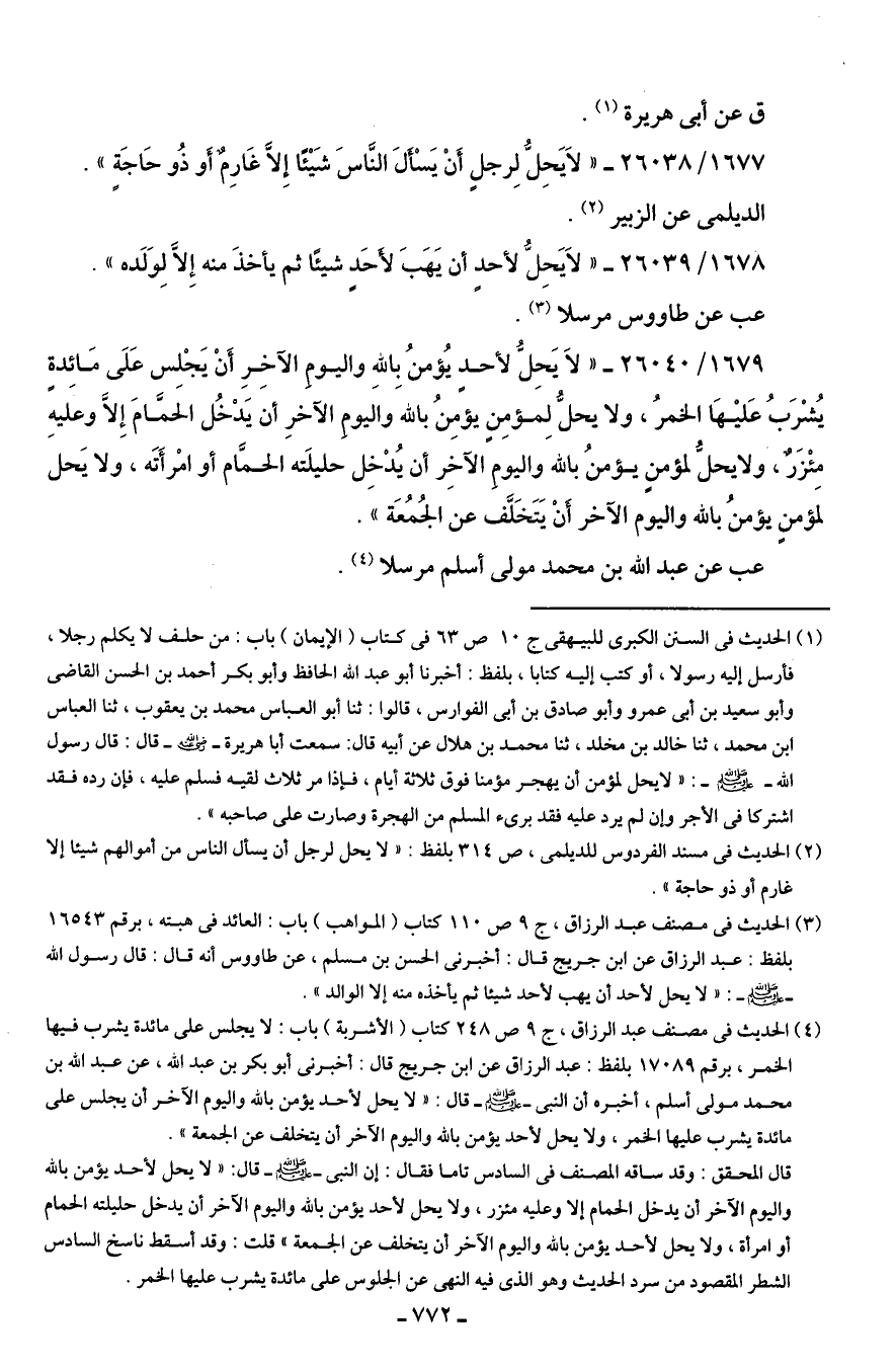 1679/ 26040 - "لَا يَحِلُّ لأحد يُؤمنُ بِاللهِ واليومِ الآخِرِ أَنْ يَجْلِس عَلَى مَائِدةٍ يُشْرَبُ عَليهَا الخمرُ، ولا يحلُّ لِمؤمِنٍ يؤمِنُ بالله واليومِ الآخرِ أن يَدْخُل الحمَّامَ إلا وعليهِ مِئْزَرٌ، ولا يحلُّ لمؤمنٍ يؤمنُ بالله واليومِ الآخِر أن يُدْخِل حليلَته الحمَّام أو امْرأَتَه، ولا يَحل لمؤمنٍ يؤمنُ بالله واليوم الآخر أنْ يَتَخَلَّف عن الجُمُعَة".