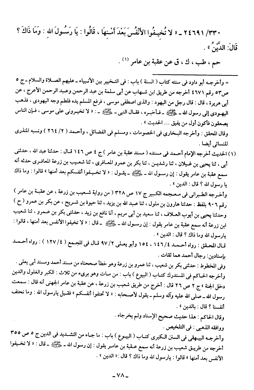 330/ 24691 - "لا تُخِيفُوا الأَنْفُسَ بَعْدَ أَمْنِهَا، قَالُوا: يَا رَسُولَ اللهِ: وَمَا ذَاكَ؟ قَال: الدَّينُ".