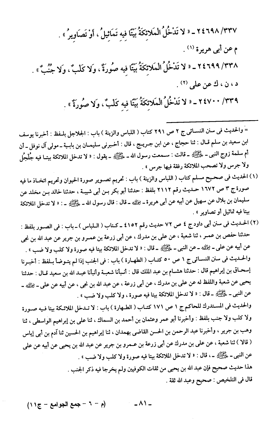 338/ 24699 - "لا تَدْخُلُ الْمَلائِكَةُ بَيتًا فِيه صُورَةٌ، وَلا كَلْبٌ، وَلا جُنُبٌ".
