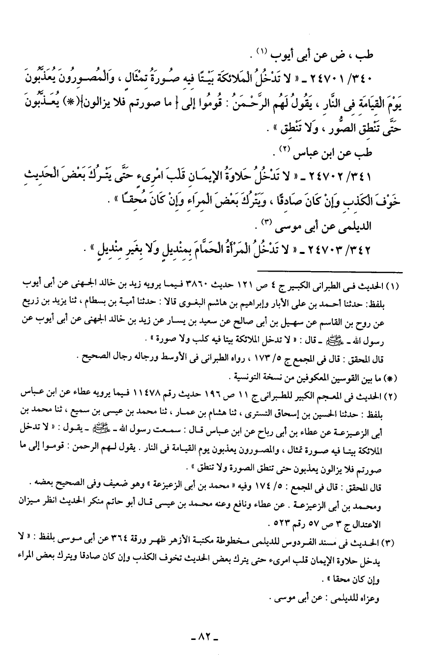 (¬1) الحديث في الطبراني الكبير ج 4 ص 121 حديث 3860 فيما يرويه زيد بن خالد الجهني عن أَبي أيوب بلفظ: حدثنا أحمد بن علي الأبار وإبراهيم بن هاشم البغوي قالا: حدثنا أمية بن بسطام، ثنا يزيد بن زريع عن روح بن القاسم عن سهيل بن أبي صالح عن سعيد بن يسار عن زيد بن خالد الجهني عن أَبي أيوب عن رسول الله - صلى الله عليه وسلم - قال: "لا تدخل الملائكة بيتا فيه كلب ولا صورة".