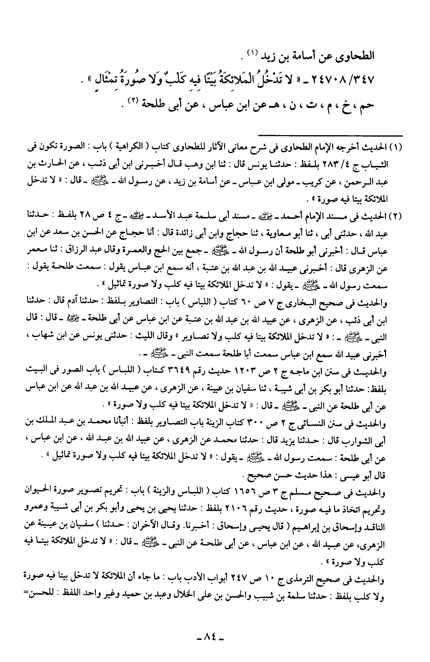 (¬1) الحديث أخرجه الإمام الطحاوي في شرح معاني الآثار للطحاوى كتاب (الكراهية) باب: الصورة تكون في الثياب ج 4/ 283 بلفظ: حدثنا يونس قال: ثنا ابن وهب قال أخبرني ابن أَبي ذئب، عن الحارث بن عبد الرحمن، عن كريب -مولى ابن عباس- عن أسامة بن زيد، عن رسول الله - صلى الله عليه وسلم - قال: "لا تدخل الملائكة بيتا فيه صورة".