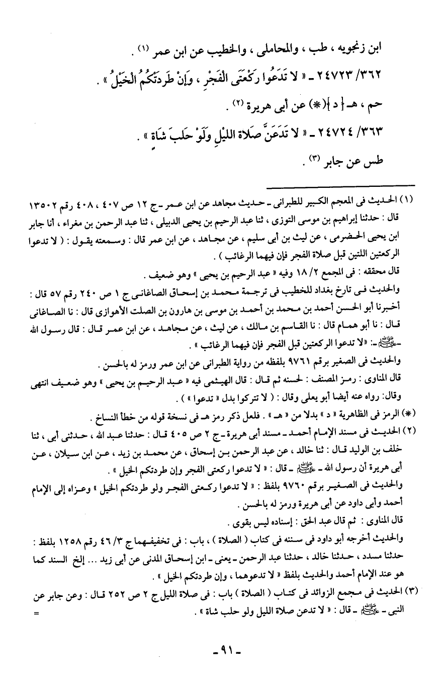 362/ 24723 - "لا تَدَعُوا رَكْعَتَي الْفَجْرِ، وَإنْ طَردَتْكُمُ الْخَيلُ".