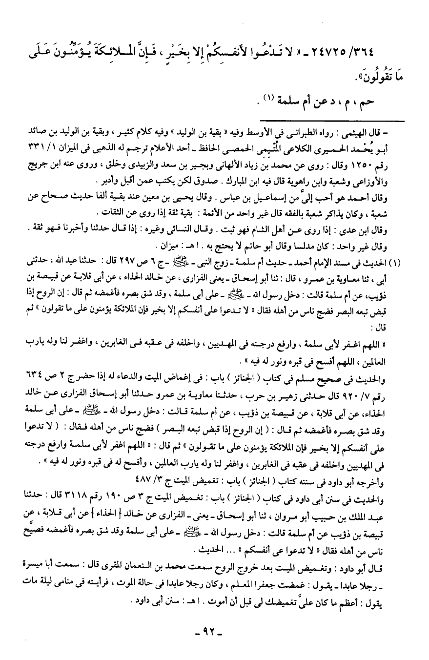 (¬1) الحديث في مسند الإمام أحمد - حديث أم سلمة- زوج النبي - صلى الله عليه وسلم - ج 6 ص 297 قال: حدثنا عبد الله، حدثني أبي، ثنا معاوية بن عمرو، قال: ثنا أبو إسحاق - يعني الفزاري، عن خالد الحذاء، عن أبي قلابة عن قبيصة بن ذؤيب، عن أم سلمة قالت: دخل رسول الله - صلى الله عليه وسلم - على أَبى سلمة، وقد شق بصره فأغمضه ثم قال: إن الروح إذا قبض تبعه البصر فضج ناس من أهله فقال "لا تدعوا على أنفسكم إلا بخير فإن الملائكة يؤمنون على ما تقولون" ثم قال: