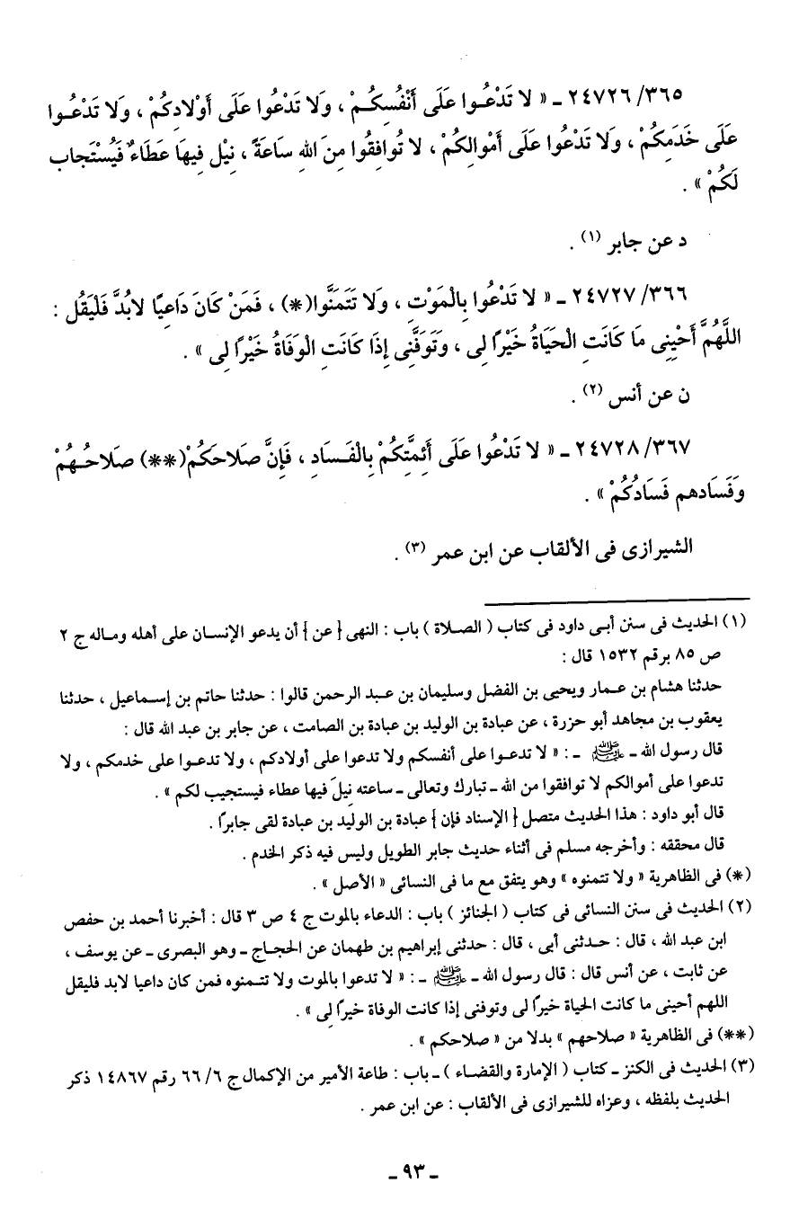 365/ 24726 - "لا تَدْعُوا عَلَى أَنْفُسِكُمْ، وَلا تَدْعُوا عَلَى أَوْلادِكُمْ، وَلا تَدْعُوا عَلَى خَدَمِكُمْ، وَلا تَدْعُوا عَلَى أَمْوالِكُمْ، لا تُوافِقُوا منَ اللهِ سَاعَةً، نِيل فِيهَا عَطَاءٌ فَيُسْتَجاب لَكُمْ".