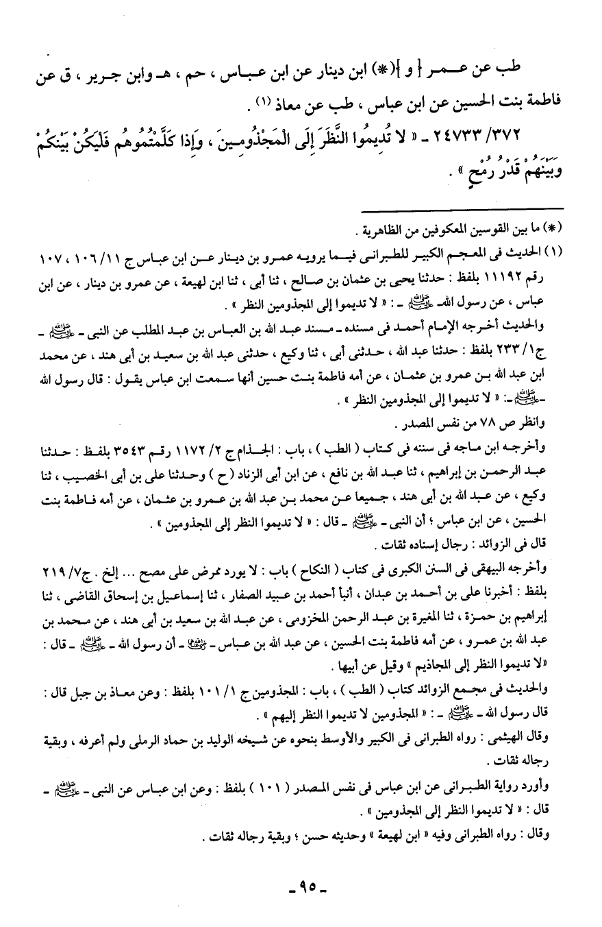 وأورد رواية الطبراني عن ابن عباس في نفس المصدر (101) بلفظ: وعن ابن عباس عن النبي - صلى الله عليه وسلم - قال: "لا تديموا النظر إلى المجذومين".