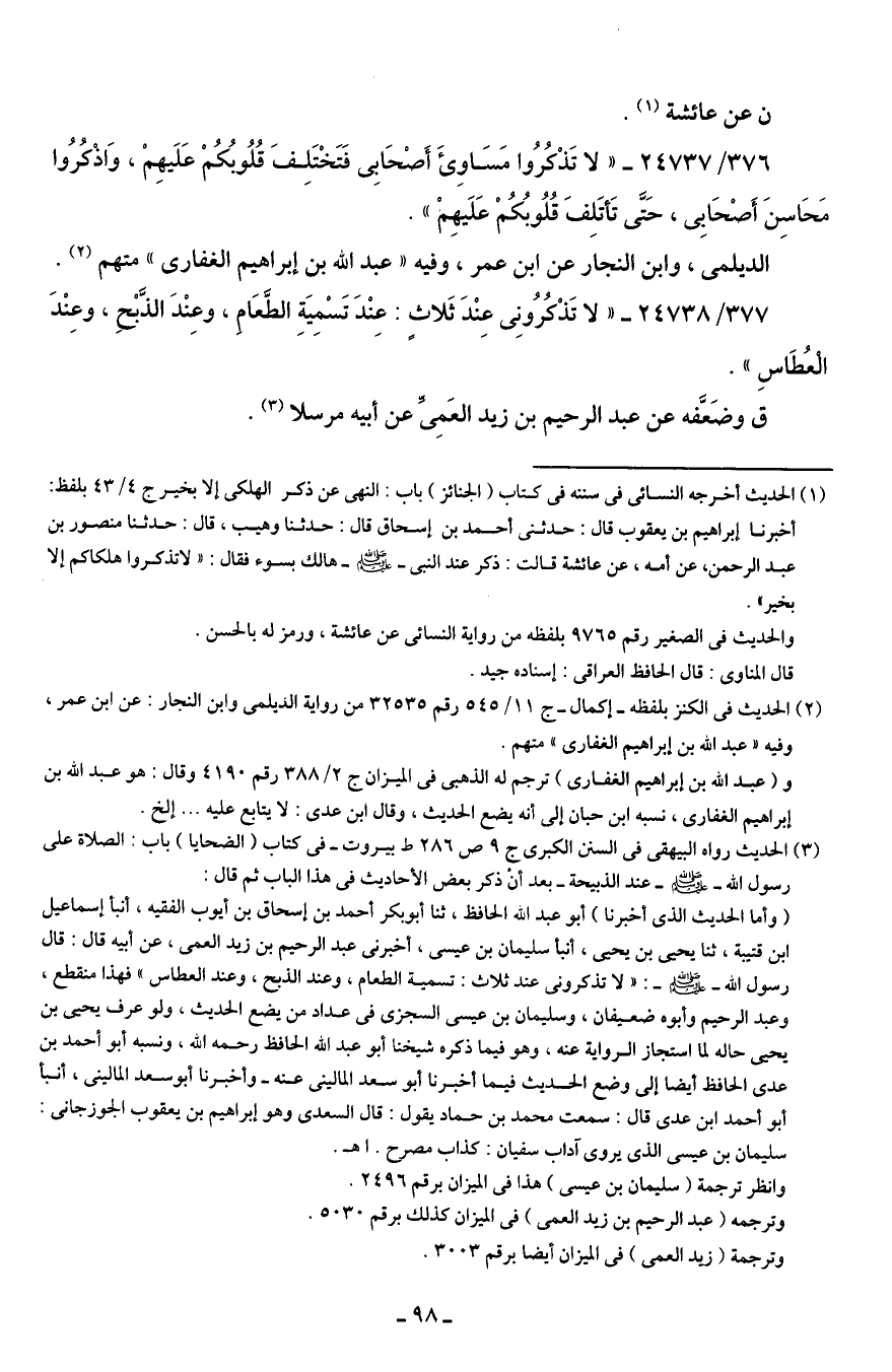 (وأما الحديث الذي أخبرنا) أبو عبد الله الحافظ، ثنا أبو بكر أحمد بن إسحاق بن أيوب الفقيه، أنبأ إسماعيل بن قتيبة، ثنا يحيى بن يحيى، أنبأ سليمان بن عيسى، أخبرني عبد الرحيم بن زيد العمى، عن أبيه قال: قال رسول الله - صلى الله عليه وسلم -: "لا تذكرونى عند ثلاث: تسمية الطعام، وعند الذبح، وعند العطاس" فهذا منقطع، وعبد الرحيم وأبوه ضعيفان، وسليمان بن عيسى السجزى في عداد من يضع الحديث، ولو عرف يحيى بن يحيى حاله لما استجاز الرواية عنه، وهو فيما ذكره شيخنا أبو عبد الله الحافظ رحمه الله، ونسبه أبو أحمد بن عدى الحافظ أيضًا إلى وضع الحديث فيما أخبرنا أبو سعد المالينى عنه -وأخبرنا أبو سعد المالينى، أنبأ أبو أحمد بن عدي قال: سمعت محمد بن حماد يقول: قال السعدي وهو إبراهيم بن يعقوب الجوزجاني: سليمان بن عيسى الذي يروى آداب سفيان: كذاب مصرح. اهـ.