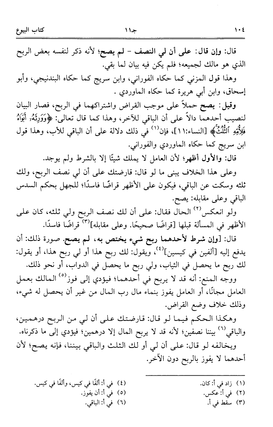 وقيل: يصح حملاً على موجب القراض واشتراكهما في الربح، فصار البيان لنصيب أحدهما دالاً على أن الباقي للآخر، وهذا كما قال تعالى: {وَوَرِثَهُ أَبَوَاهُ فَلأُمِّهِ الثُّلُثُ} [النساء: 11] فإن في ذلك دلالة على أن الباقي للأب، وهذا قول ابن سريج كما حكاه الماوردي والفوراني.