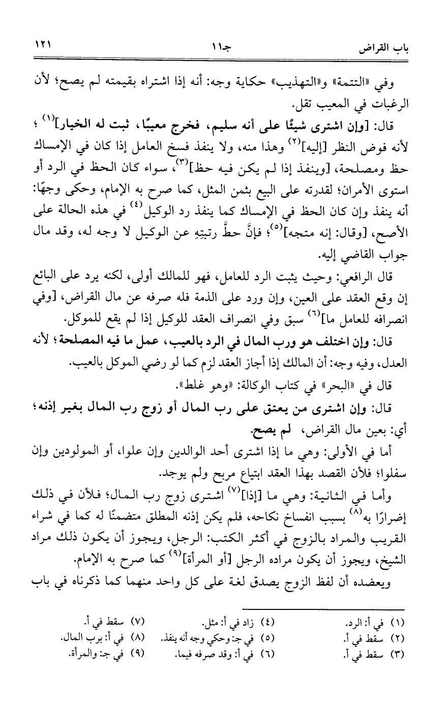 قال الرافعي: وحيث يثبت الرد للعامل، فهو للمالك أولى، لكنه يرد على البائع إن وقع العقد على العين، وإن ورد على الذمة فله صرفه عن مال القراض، [وفي انصرافه للعامل ما] سبق وفي انصراف العقد للوكيل إذا لم يقع للموكل.