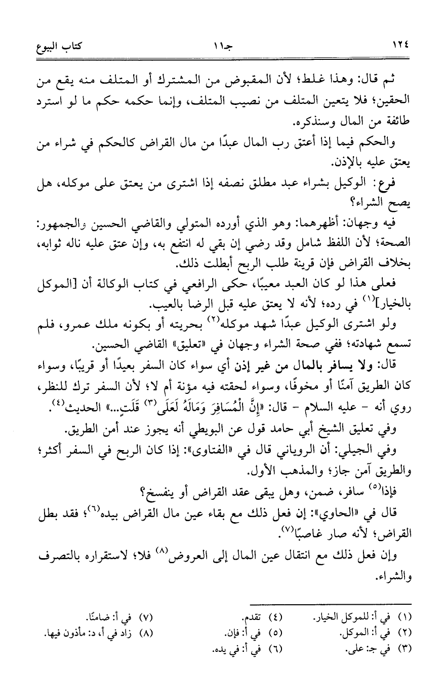 قال: ولا يسافر بالمال من غير إذن أي سواء كان السفر بعيداً أو قريباً، وسواء كا الطريق آمناً أو مخوفاً، وسواء لحقته فيه مؤنة أم لا؛ لأن السفر ترك للنظر، روي أنه- عليه السلام- قال: "إِنَّ المُسَافِرَ وَمَالَهُ لَعَلَى قَلَتٍ .. " الحديث.