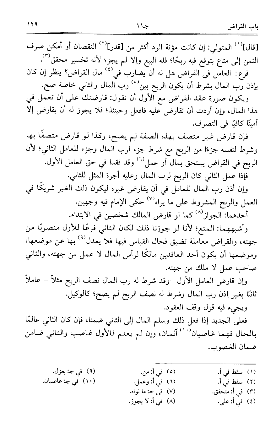 ويكون صورة عقد القراض مع الأول أن تقول: قارضتك على أن تعمل في هذا المال، وإن أردت أن تقارض عليه فافعل وحينئذ؛ فلا يجوز له أن يقارض إلا أميناً كافياً في التصرف.