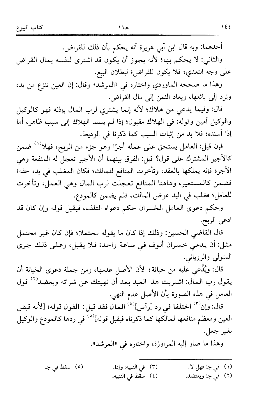 وهذا ما صححه الماوردي واختاره في "المرشد" وقال: إن العين تنزع من يده وترد إلى بائعها، ويعاد الثمن إلى مال القراض.