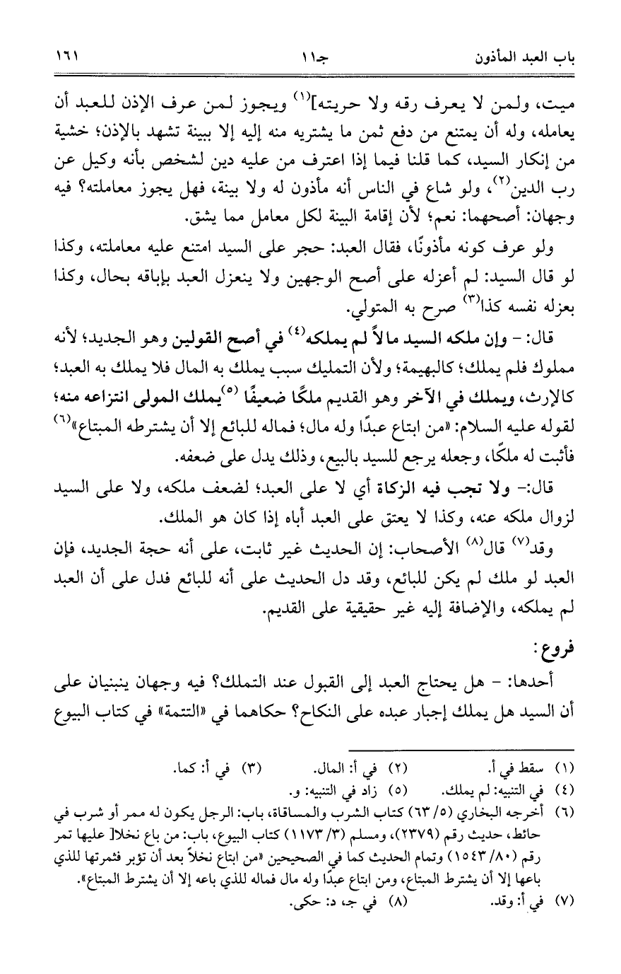 قال: وإن ملكه السيد مالاً لم يملكه في أصح القولين وهو الجديد؛ لأنه مملوك فلم يملك؛ كالبهيمة؛ ولأن التمليك سبب يملك به المال فلا يملك به العبد؛ كالإرث، ويملك في الآخر وهو القديم ملكاً ضعيفاً يملك المولى انتزاعه منه؛ لقوله عليه السلام: "من ابتاع عبداً وله مال؛ فماله للبائع إلا أن يشترطه المبتاع" فأثبت له ملكاً، وجعله يرجع للسيد بالبيع، وذلك يدل على ضعفه.