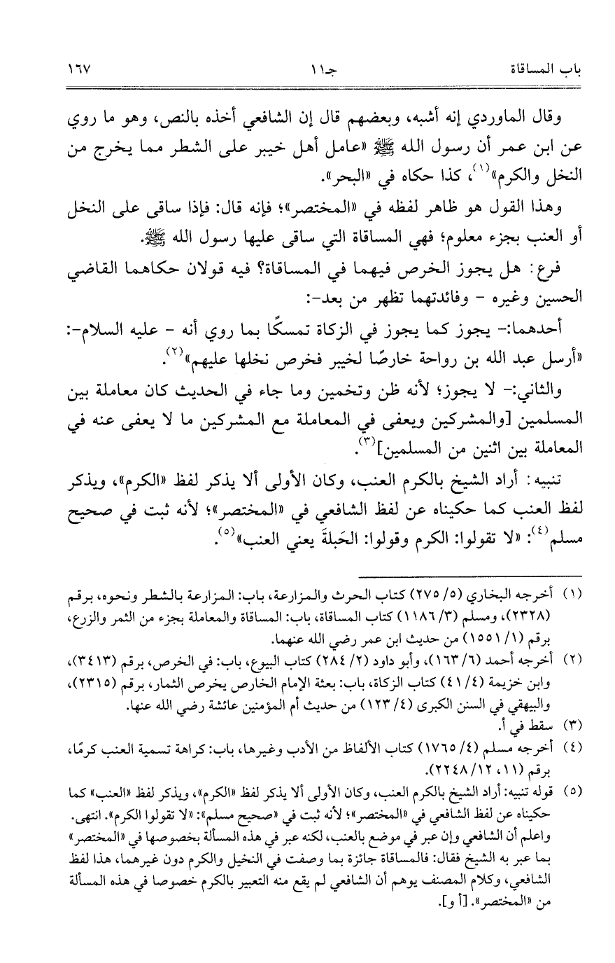 تنبيه: أراد الشيخ بالكرم العنب، وكان الأولى ألا يذكر لفظ "الكرم"، ويذكر لفظ العنب كما حكيناه عن لفظ الشافعي في "المختصر"؛ لأنه ثبت في صحيح مسلم: "لا تقولوا: الكرم وقولوا: الحبلة يعني العنب".