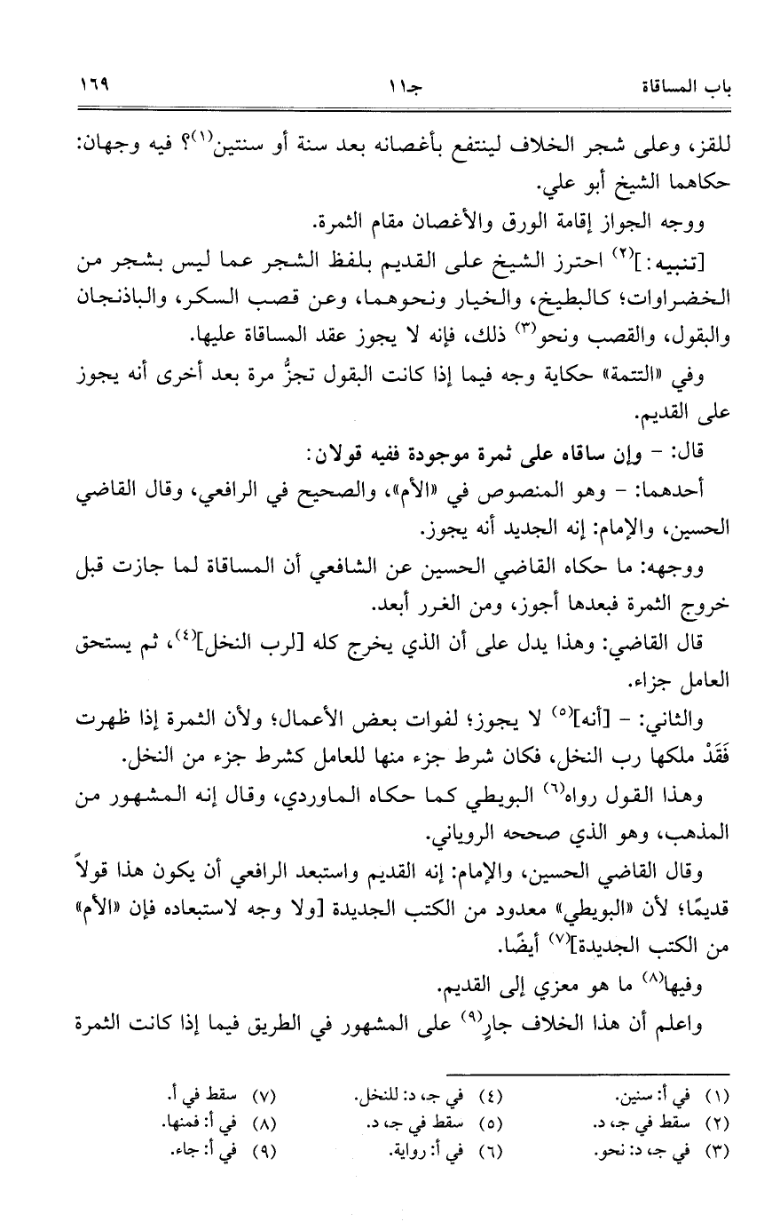 [تنبيه:] احترز الشيخ على القديم بلفظ الشجر عما ليس بشجر من الخضراوات؛ كالبطيخ، والخيار ونحوهما، وعن قصب السكر، والباذنجان والبقول، والقصب ونحو ذلك، فإنه لا يجوز عقد المساقاة عليها.