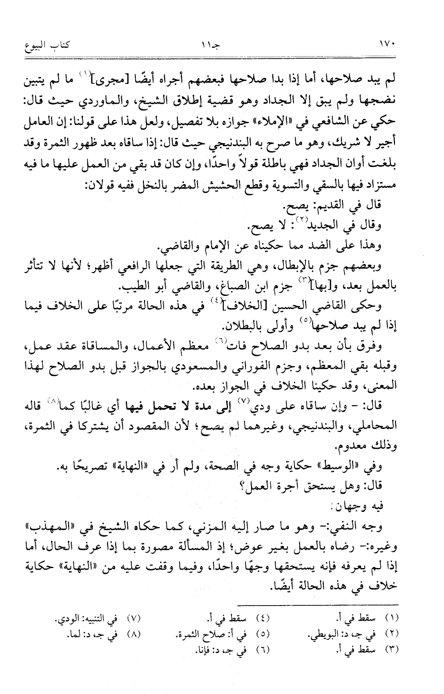 لم يبد صلاحها، أما إذا بدا صلاحها فبعضهم أجراه أيضاً [مجرى] ما لم يتبين نضجها ولم يبق إلا الجداد وهو قضية إطلاق الشيخ، والماوردي حيث قال: حكي عن الشافعي في "الإملاء" جوازه بلا تفصيل، ولعل هذا على قولنا: إن العامل أجير لا شريك، وهو ما صرح به البندنيجي حيث قال: إذا ساقاه بعد ظهور الثمرة وقد بلغت أوان الجداد فهي باطلة قولاً واحداً، وإن كان قد بقي من العمل عليها ما فيه مستزاد فيها بالسقي والتسوية وقطع الحشيش المضر بالنخل ففيه قولان: