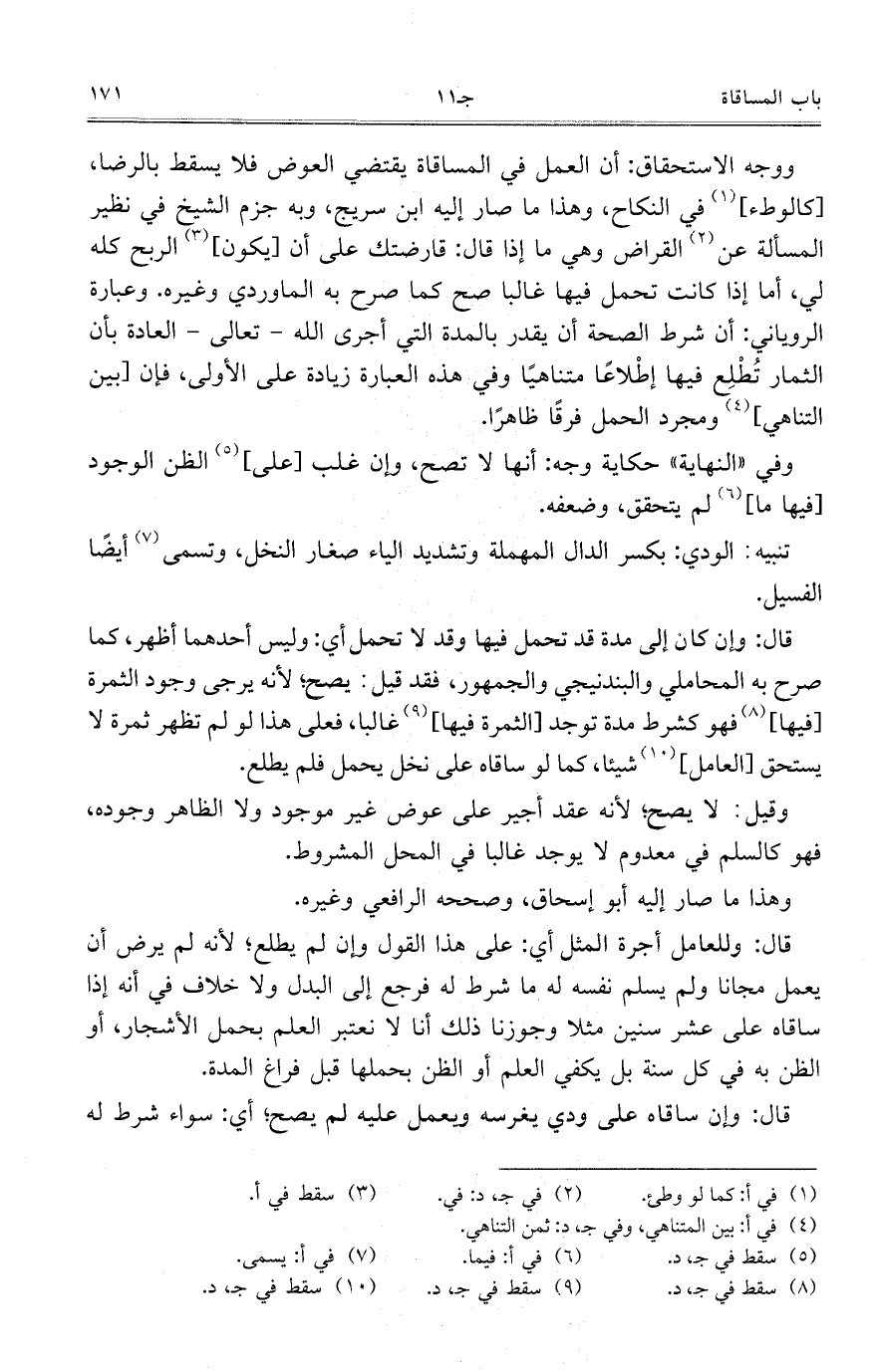 ووجه الاستحقاق: أن العمل في المساقاة يقتضي العوض فلا يسقط بالرضا، [كالوطء] في النكاح، وهذا ما صار إليه ابن سريج، وبه جزم الشيخ في نظير المسألة عن القراض وهي ما إذا قال: قارضتك على أن [يكون] الربح كله لي، أما إذا كانت تحمل فيها غالباً صح كما صرح به الماوردي وغيره. وعبارة الروياني: أن شرط الصحة أن يقدر بالمدة التي أجرى الله- تعالى- العادة بأن الثمار تطلع فيها إطلاعاً متناهياً وفي هذه العبارة زيادة على الأولى، فإن [بين التناهي] ومجرد الحمل فرقاً ظاهراً.