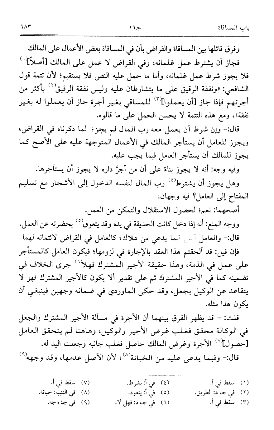 وفرق قائلها بين المساقاة والقراض بأن في المساقاة بعض الأعمال على المالك.