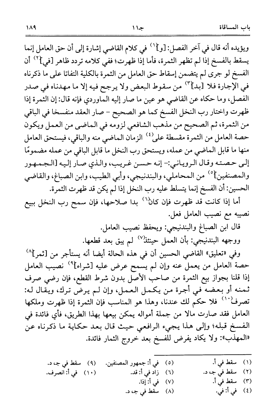 ويؤيده أنه قال في آخر الفصل: [و] في كلام القاضي إشارة إلى أن حق العامل إنما يسقط بالفسخ إذا لم تظهر الثمرة، فأما إذا ظهرت؛ ففي كلامه تردد ظاهر [في] أن الفسخ لو جرى لم يتضمن إسقاط حق العامل من الثمرة بالكلية التفاتاً على ما ذكرناه في الإجارة فلا [بد] من سقوط البعض ولا يرجح فيه إلا ما مهدناه في صدر الفصل، وما حكاه عن القاضي هو عين ما صار إليه الماوردي فإنه قال: إن الثمرة إذا ظهرت واختار رب النخل الفسخ كما هو الصحيح- صار العقد منفسخاً في الباقي من الثمرة، ثم الصحيح من مذهب الشافعي لزومه في الماضي من العمل ويكون حصة العامل من الثمرة مقسطة على الزمان الماضي منه والباقي، فيستحق العامل منها ما قابل الماضي من عمله، ويستحق رب النخل ما قابل الباقي من عمله مضموماً إلى حصته وقال الروياني: إنه حسن غريب، والذي صار إليه [الجمهور والمصنفين] من المحاملي، والبندنيجي، وأبي الطيب، وابن الصباغ، والقاضي الحسين: أن الفسخ إنما يتسلط عليه رب النخل إذا لم يكن قد ظهرت الثمرة.