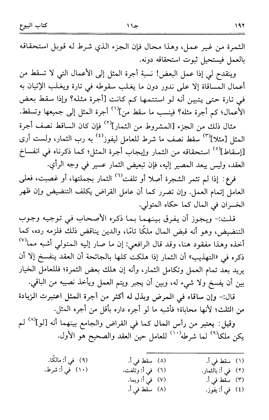وينقدح لي إذا علم البعض! نسبة أجرة المثل إلى الأعمال التي لا تسقط من أعمال المساقاة إلا على ندور دون ما يغلب سقوطه في تارة ويغلب الإتيان به في تارة حتى يتبين أنه لو استتمها كم كانت [أجرة مثله؟ وإذا سقط بعض الأعمال؛ كم أجرة مثله؟ فينسب ما سقط من] أجرة المثل إلى جميعها وتسقط.