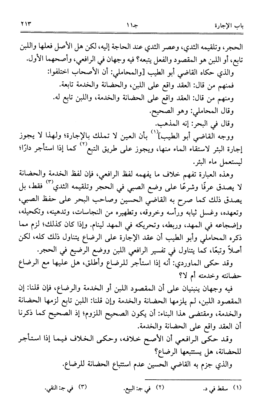 وهذه العبارة تفهم خلاف ما يفهمه لفظ الرافعي، فإن لفظ الخدمة والحضانة لا يصدق عرفاً وشرعاً على وضع الصبي في الحجر وتلقيمه الثدي فقط، بل يصدق ذلك كما صرح به القاضي الحسين وصاحب البحر على حفظ الصبي، وتعهده، وغسل ثيابه ورأسه وخروقه، وتطهيره من النجاسات، وتدهينه، وتكحيله، وإضجاعه في المهد، وربطه، وتحريكه في المهد لينام. وإذا كان كذلك؛ لزم مما ذكره المحاملي وأبو الطيب أن عقد الإجارة على الرضاع يتناول ذلك كله، لكن أصلاً وتبعاً، كما يتناول في تفسير الرافعي اللبن ووضع الرضيع في الحجر.