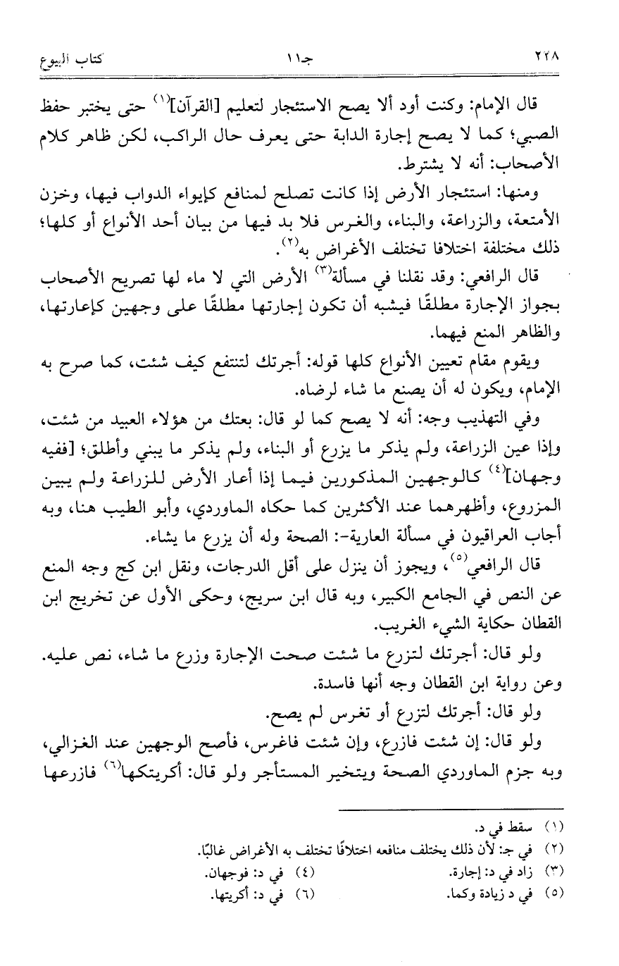 ومنها: استئجار الأرض إذا كانت تصلح لمنافع كإيواء الدواب فيها، وخزن الأمتعة، والزراعة، والبناء، والغرس فلا بد فيها من بيان أحد الأنواع أو كلها؛ ذلك مختلفة اختلافاً تختلف الأغراض به.