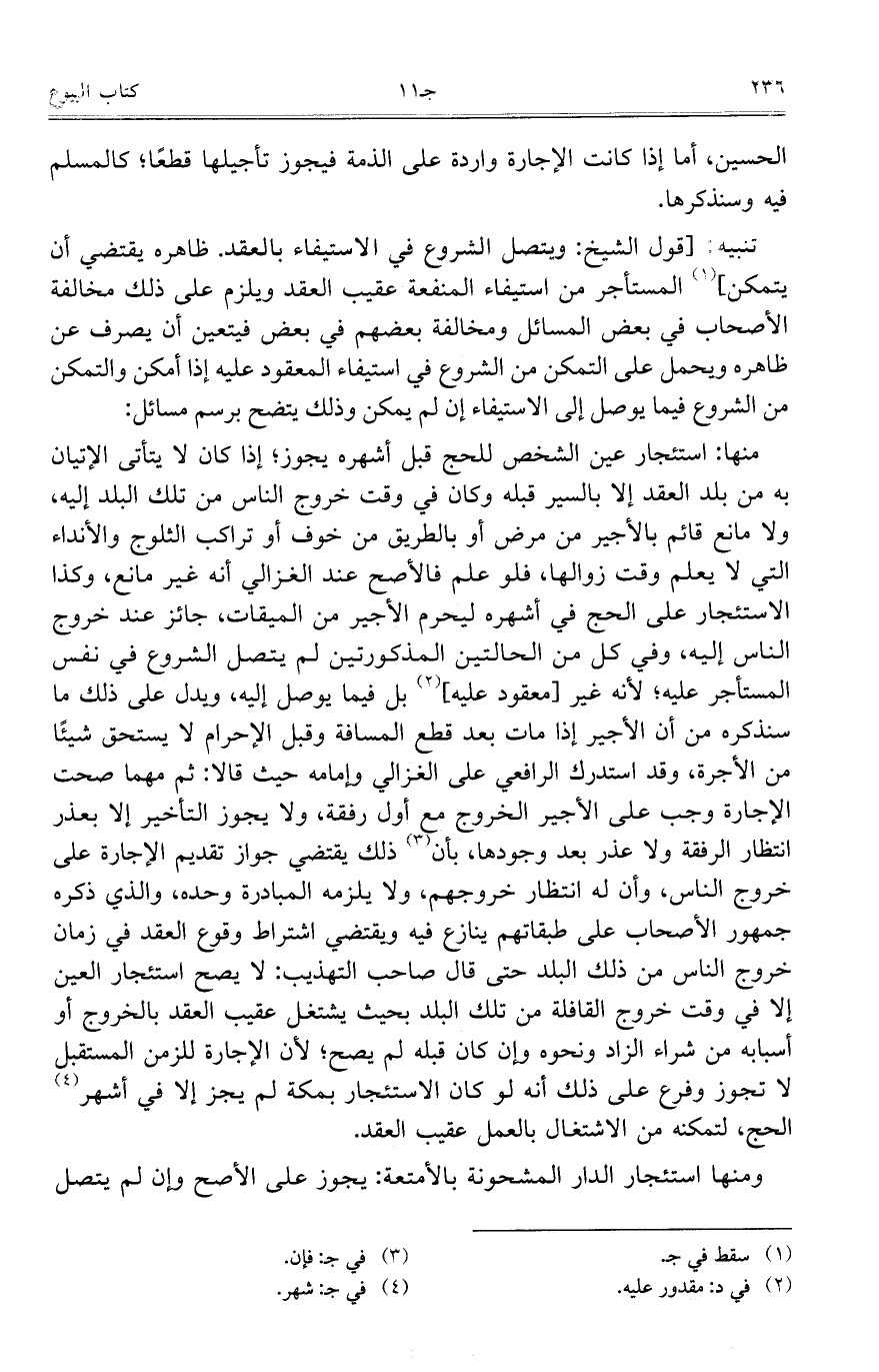 الحسين، أما إذا كانت الإجارة واردة على الذمة فيجوز تأجيلها قطعاً؛ كالمسلم فيه وسنذكرها.