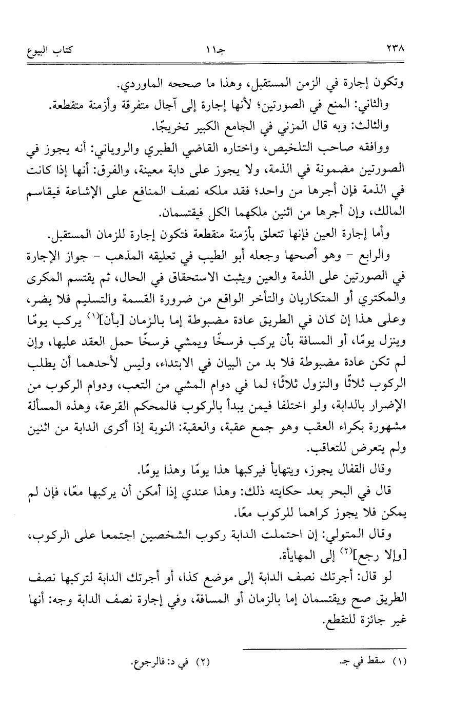 والرابع- وهو أصحها وجعله أبو الطيب في تعليقه المذهب- جواز الإجارة في الصورتين على الذمة والعين ويثبت الاستحقاق في الحال، ثم يقتسم المكرى والمكتري أو المتكاريان والتأخر الواقع من ضرورة القسمة والتسليم فلا يضر، وعلى هذا إن كان في الطريق عادة مضبوطة إما بالزمان [بأن] يركب يوماً وينزل يوماً، أو المسافة بأن يركب فرسخاً ويمشي فرسخاً حمل العقد عليها، وإن لم تكن عادة مضبوطة فلا بد من البيان في الابتداء، وليس لأحدهما أن يطلب الركوب ثلاثاً والنزول ثلاثاً؛ لما في دوام المشي من التعب، ودوام الركوب من الإضرار بالدابة، ولو اختلفا فيمن يبدأ بالركوب فالمحكم القرعة، وهذه المسألة مشهورة بكراء العقب وهو جمع عقبة، والعقبة: النوبة إذا أكرى الدابة من اثنين ولم يتعرض للتعاقب.