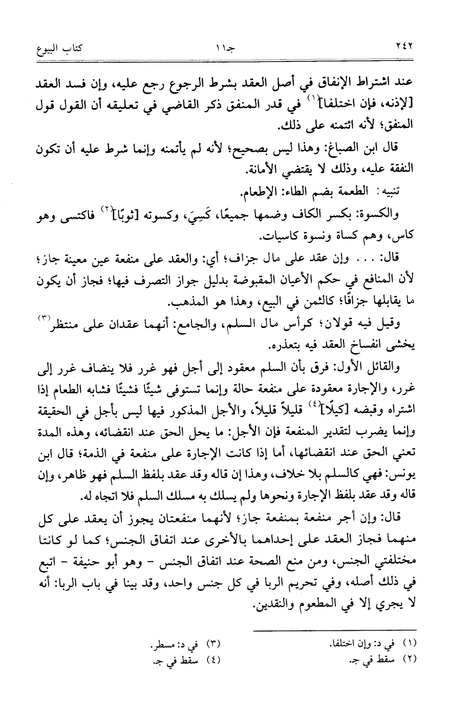والقائل الأول: فرق بأن السلم معقود إلى أجل فهو غرر فلا ينضاف غرر إلى غرر، والإجارة معقودة على منفعة حالة وإنما تستوفي شيئاً فشيئاً فشابه الطعام إذا اشتراه وقبضه [كيلاً] قليلاً قليلاً، والأجل املذكور فيها ليس بأجل في الحقيقة وإنما يضرب لتقدير المنفعة فإن الأجل: ما يحل الحق عند انقضائه، وهذه المدة تعني الحق عند انقضائها، أما إذا كانت الإجارة على منفعة في الذمة؛ قال ابن يونس: فهي كالسلم بلا خلاف، وهذا إن قاله وقد عقد بلفظ السلم فهو ظاهر، وإن قاله وقد عقد بلفظ الإجارة ونحوها ولم يسلك به مسلك السلم فلا اتجاه له.