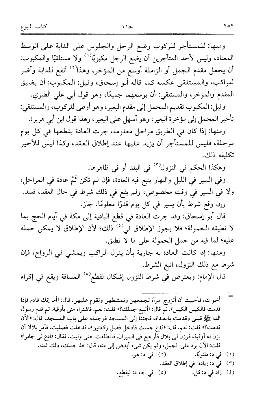 ومنها: للمستأجر للركوب وضع الرجل والجلوس على الدابة على الوسط المعتاد، وليس لأحد المتآجرين أن يضع الرجل مكبوباً ولا مستلقياً والمكبوب: أن يجعل مقدم الجمل أو الزاملة أوسع من المؤخر، وهذا أنفع للدابة وأضر للراكب، والمستلقى عكسه كما قاله أبو إسحاق، وقيلك المكبوب: أن يضيق المقدم والمؤخر، والمستلقي: أن يوسعهما جميعاً، وهو قول أبي علي الطبري.