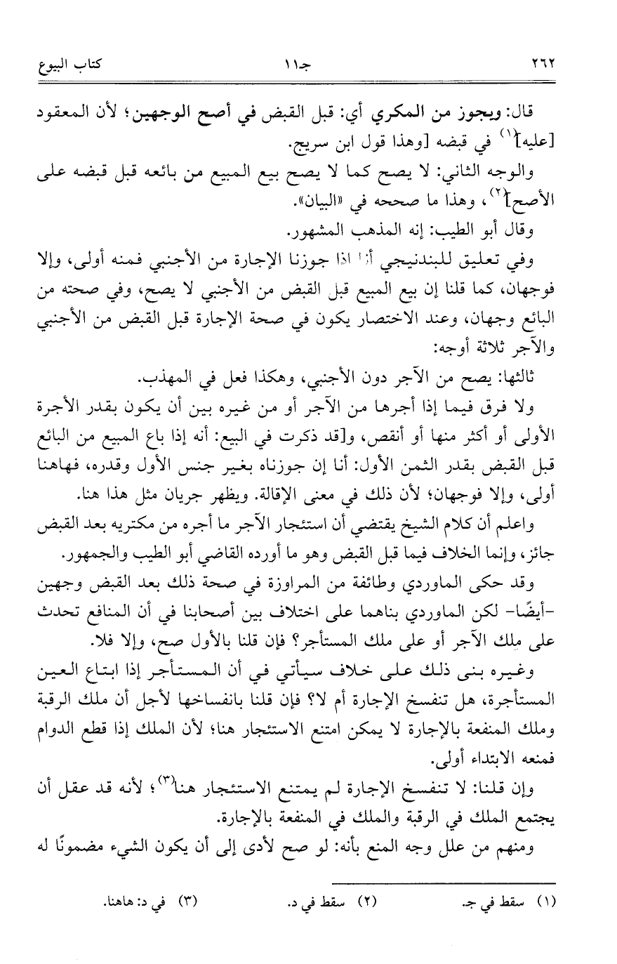 وقد حكى الماوردي وطائفة من المراوزة في صحة ذلك بعد القبض وجهين – أيضاً- لكن الماوردي بناهما على اختلاف بين أصحابنا في أن المنافع تحدث على ملك الآجر أو على ملك المستأجر؟ فإن قلنا بالأول صح، وإلا فلا.