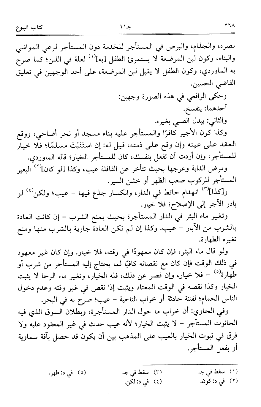 ولو قال ماء البئر، فإن كان مععهوداً في وقته، فلا خيار. وإن كان غير معهود في ذلك الوقت فإن كان مع نقصانه كافياً لما يحتاج إليه المستأجر من شرب أو طهارة- فلا خيار، وإن قصر عن ذلك، فله الخيار، وتغير ماء الرحا لا يثبت الخيار وكذا نقصه في الوقت المعتاد ويثبت إذا نقص في غير وقته وعدم دخول الناس الحمام؛ لفتنة حادثة أو خراب الناحية- عيب؛ صرح به في البحر.
