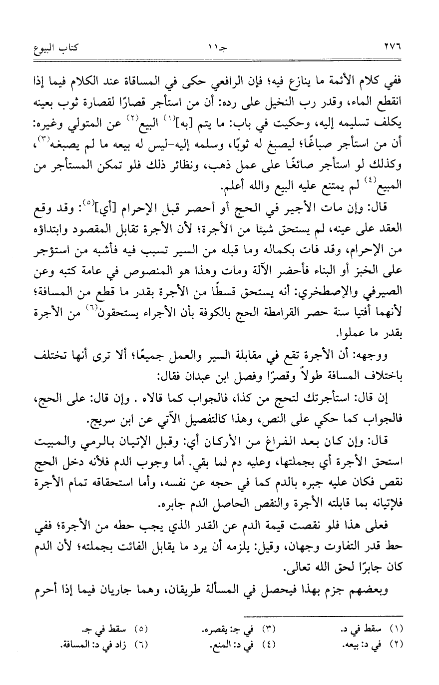 فعلى هذا فلو نقصت قيمة الدم عن القدر الذي يجب حطه من الأجرة؛ ففي حط قدر التفاوت وجهان، وقيل: يلزمه أن يرد ما يقابل الفائت بجملته؛ لأن الدم كان جابراً لحق الله تعالى.