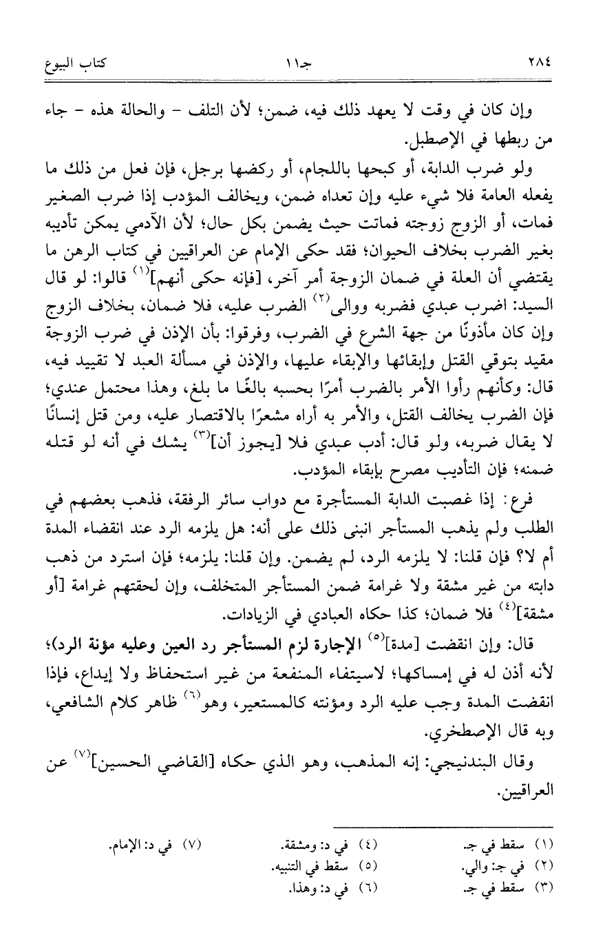 ولو ضرب الدابة، أو كبحها باللجام، أو ركضها برجل، فإن فعل من ذلك ما يفعله العامة فلا شيء عليه وإن تعداه ضمن، ويخالف المؤدب إذا ضرب الصغير فمات، أو الزوج وزجته فماتت حيث يضمن بكل حال؛ لأن الآدمي يمكن تأديبه بغير الضرب بخلاف الحيوان؛ فقد حكى الإمام عن العراقيين في كتاب الرهن ما يقتضي أن العلة في ضمان الزوجة أمر آخر، [فإنه حكى أنهم] قالوا: لو قال السيد: اضرب عبدي فضربه ووالى الضرب عليه، فلا ضمان، بخلاف الزوج وإن كان مأذوناً من جهة الشرع في الضرب، وفرقوا: بأن الإذن في ضرب الزوجة مقيد بتوقي القتل وإبقائها والإبقاء عليها، والإذن في مسألة العبد لا تقييد فيه، قال: وكأنهم رأوا الأمر بالضرب أمراً بحسبه بالغاً ما بلغ، وهذا محتمل عندي؛ فإن الضرب يخالف القتل، والأمر به أراه مشعراً بالاقتصار عليه، ومن قتل إنساناً لا يقال ضربه، ولو قال: أدب عبدي فلا [يجوز أن] يشك في أنه لو قتله ضمنه؛ فإن التاديب مصرح بإبقاء المؤدب.