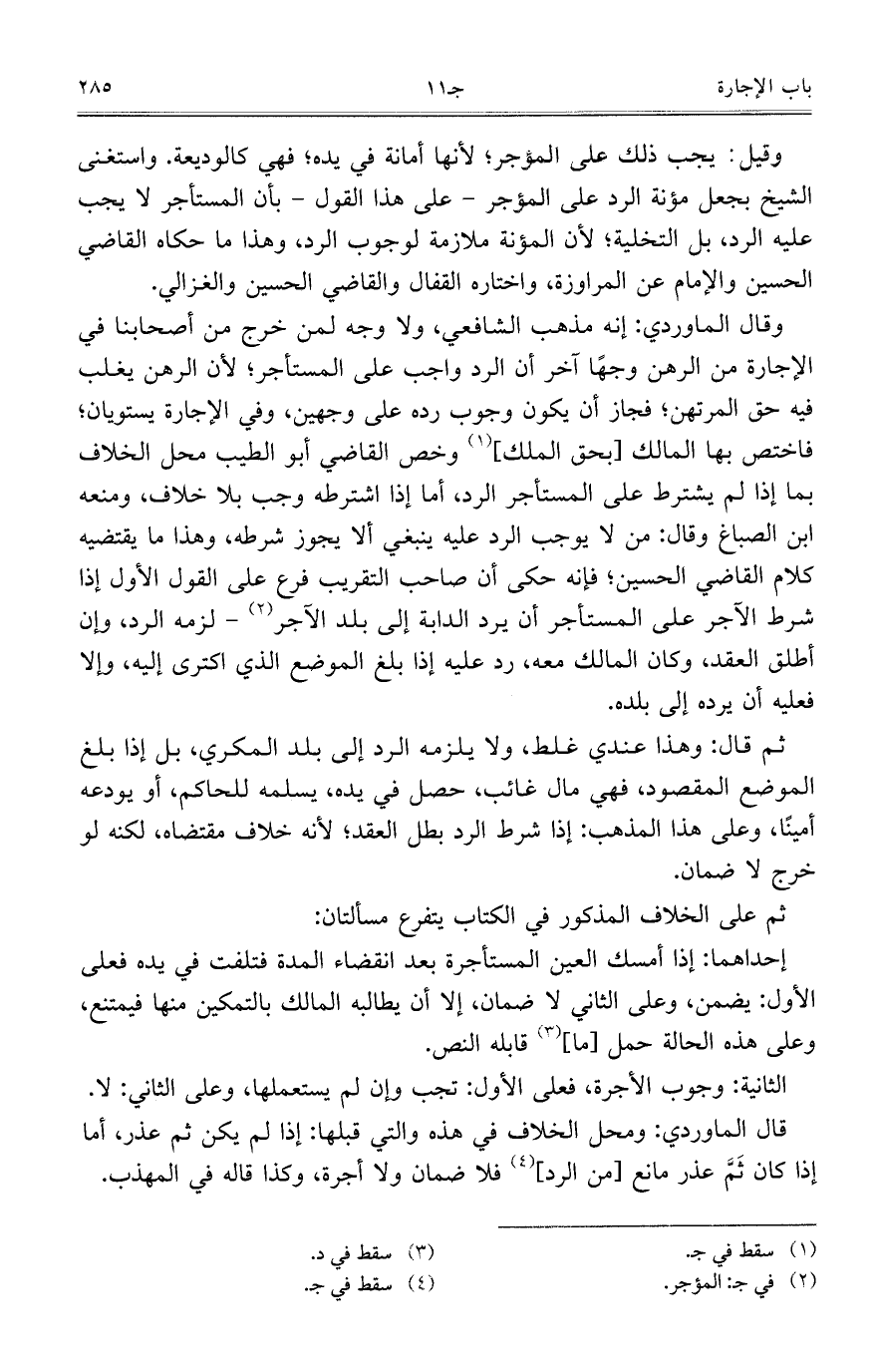 وقيل: يجب ذلك على المؤجر؛ لأنها أمانة في يده؛ فهي كالوديعة. واستغنى الشيخ بجعل مؤنة الرد على المؤجر- على هذا القول- بأن المستأجر لا يجب عليه الرد، بل التخلية؛ لأن المؤنة ملازمة لوجوب الرد، وهذا ما حكاه القاضي الحسين والإمام عن المراوزة، واختاره القفال والقاضي الحسين والغزالي.