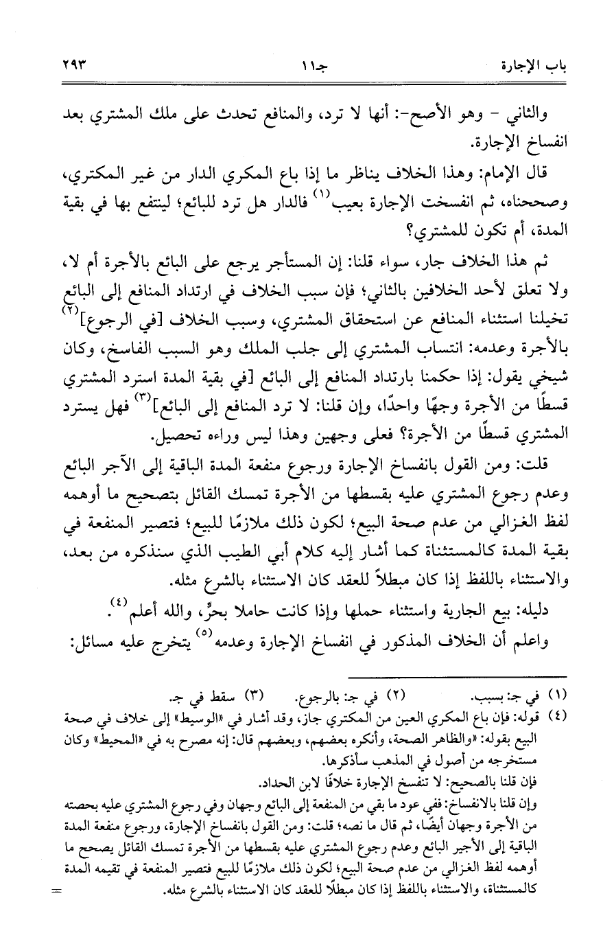 قلت: ومن القول بانفساخ الإجارة ورجوع منفعة المدة الباقية إلى الآجر البائع وعدم رجوع المشتري عليه بقسطها من الأجرة تمسك القائل بتصحيح ما أوهمه لفظ الغزالي من عدم صحة البيع؛ لكون ذلك ملازماً للبيع؛ فتصير المنفعة في بقية المدة كالمستثناة كما أشار إليه كلام أبي الطيب الذي سنذكره من بعد، والاستثناء باللفظ إذا كان مبطلاً للعقد كان الاستثناء بالشرع مثله.