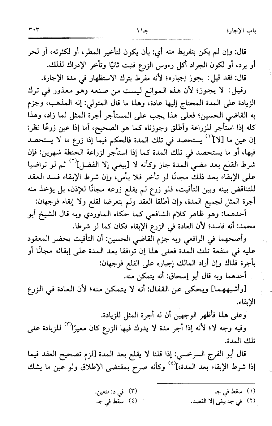 وقيل: لا يجوز؛ لأن هذه الموانع ليست من صنعه وهو معذور في ترك الزيادة على المدة المحتاج إليها عادة، وهذا ما قال المتولي: إنه المذهب، وجزم به القاضي الحسين؛ فعلى هذا يجب على المستأجر أجرة المثل لما زاد، وهذا كله إذا استأجر للزراعة وأطلق وجوزناه كما هو الصحيح، أما إذا عين زرعاً نظر: إن عين ما [لا] يستحصد في تلك المدة فالحكم فيما إذا زرع ما لا يستحصد فيها، أو ما يستحصد في تلك المدة كما إذا استأجر لزراعة الحنطة شهرين: فإن شرط القلع بعد مضي المدة جاز وكأنه لا [يبغي إلا الفضل] ثم لو تراضيا على الإبقاء بعد ذلك مجاناً لو تأخر فلا بأس، وإن شرط الإبقاء فسد العقد للتناقض بينه وبين التأقيت، فلو زرع لم يقلع زرعه مجاناً للإذن، بل يؤخذ منه أجرة المثل لجميع المدة، وإن أطلقا العقد ولم يتعرضا لقلع ولا إبقاء فوجهان: