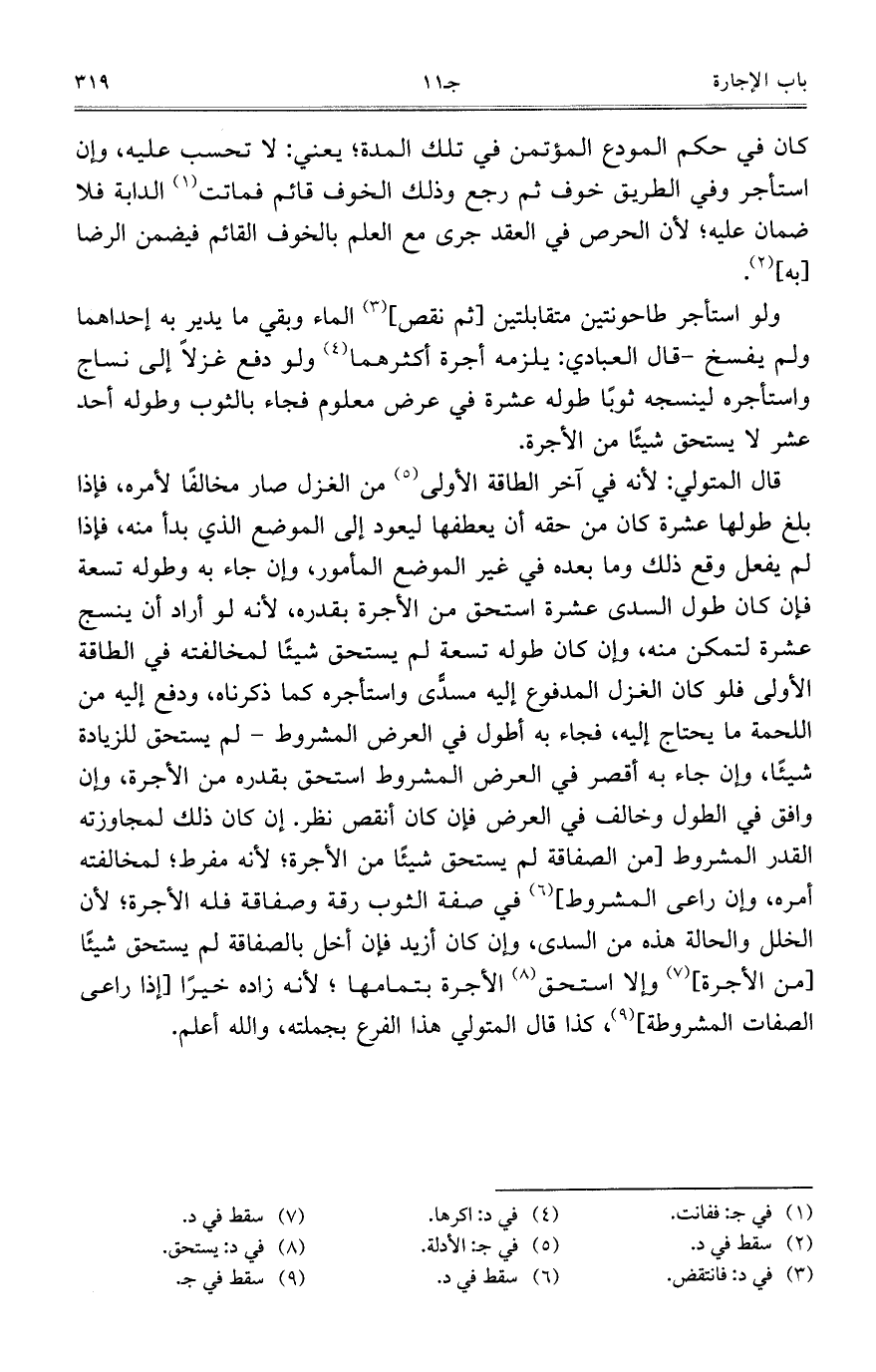 قال المتولي: لأنه في آخر الطاقة الأولى من الغزل صار مخالفاً لأمره، فإذا بلغ طولها عشرة كان من حقه أن يعطفها ليعود إلى الموضع الذي بدأ منه، فإذا لم يفعل وقع ذلك وما بعده في غير الموضع المأمور، وإن جاء به وطوله تسعة فإن كان طول السدى عشرة استحق من الأجرة بقدره، لأنه لو أراد أن ينسج عشرة لتمكن منه، وإن كان طوله تسعة لم يستحق شيئاً لمخالفته في الطاقة الأولى فلو كان الغزل المدفوع إليه مسدَّى واستأجره كما ذكرناه، ودفع إليه من اللحمة ما يحتاج إليه، فجاء به أطول في العرض المشروط- لم يستحق للزيادة شيئاً، وإن جاء به أقصر في العرض فإن كان أنقص نظر. إن كان ذلك لمجاوزته القدر المشروط [من الصفاقة لم يستحق شيئاً من الأجرة؛ لأنه مفرط؛ لمخالفته أمره، وإن راعى المشروط] في صفة الثوب رقة وصفاقة فله الأجرة؛ لأن الخلل والحالة هذه من السدى، وإن كان أزيد فإن أخل بالصفاقة لم يستحق شيئاً [من الأجرة] وإلا استحق الأجرة بتمامها؛ لأنه زاده خيراً [إذا راعى الصفات المشروطة]، كذا قال المتولي هذا الفرع بجملته، والله أعلم.