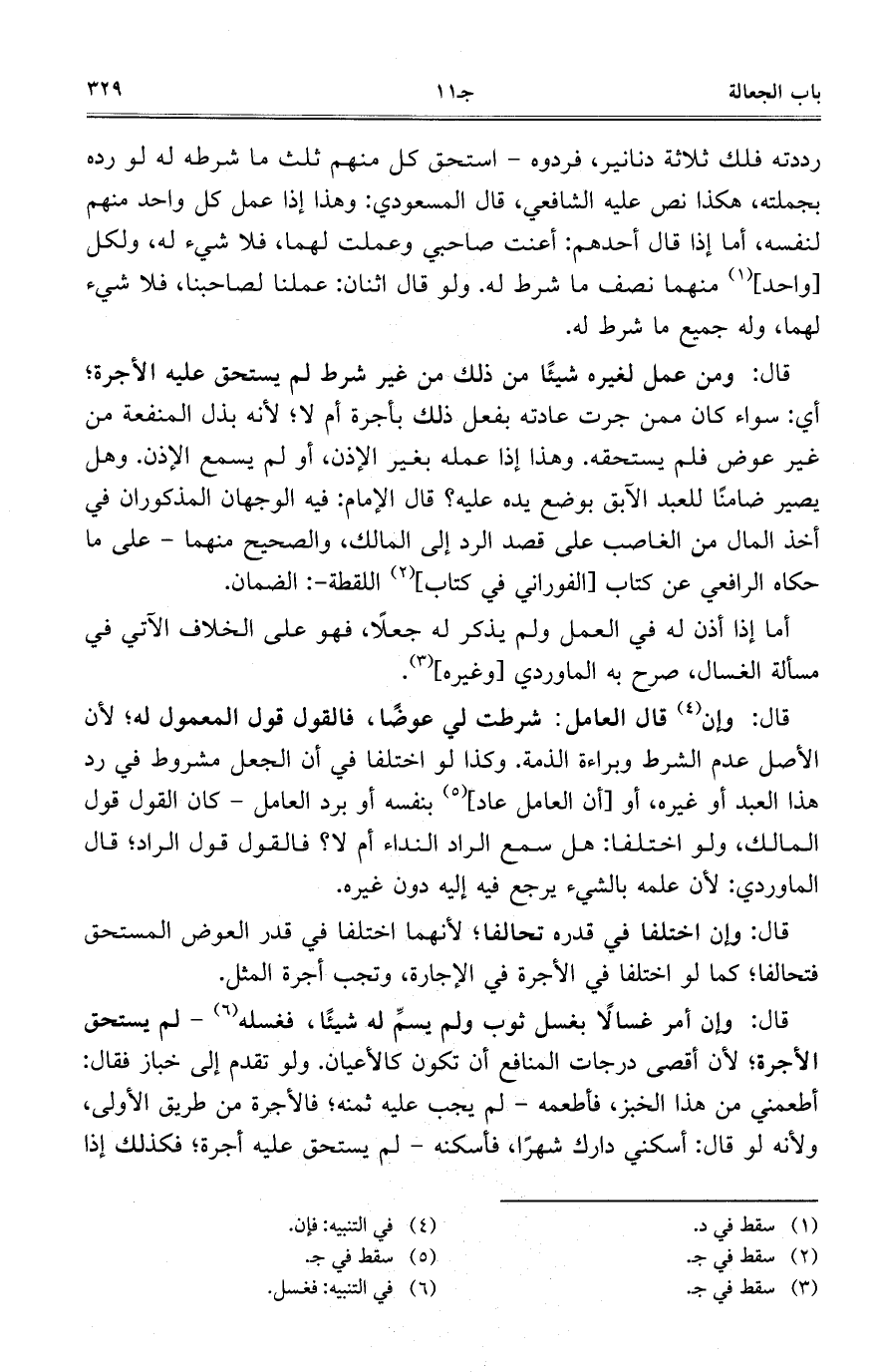 قال: وإن قال العامل: شرطت لي عوضاً، فالقول قول المعمول له؛ لأن الأصل عدم الشرط وبراءة الذمة. وكذا لو اختلفا في أن الجعل مشروط في رد هذا العبد أو غيره، أو [أن العامل عاد] بنفسه أو برد العامل- كان القول قول المالك، ولو اختلفا: هل سمع الراد النداء أم لا؟ فالقول قول الراد؛ قال الماوردي: لأن علمه بالشيء يرجع فيه إليه دون غيره.